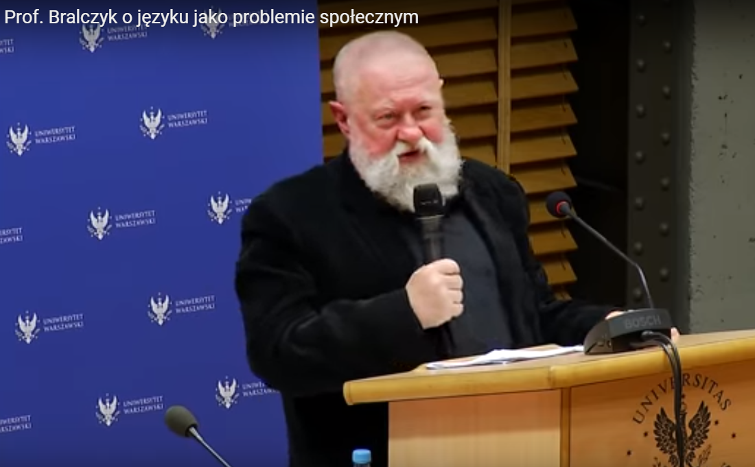 Przypomniałem to sobie, bo oglądałem, a raczej, usiłując sprzątać biurko i okolice, słuchałem wykładu profesora Jerzego Bralczyka, wygłoszonego 19 marca 2019 r. na Uniwersytecie Warszawskim. Wykład jest o języku, polskim, o tym, czy i jakim bywa problemem, a jakie problemy są z nim. Warto posłuchać. Jednak we fragmencie, który zaznaczyłem (1:04:55), zmęczony już nieco mówca, uwzględniając retorycznie dobro zmęczonych — być może — słuchaczy, mówi, o czym nie mówi: